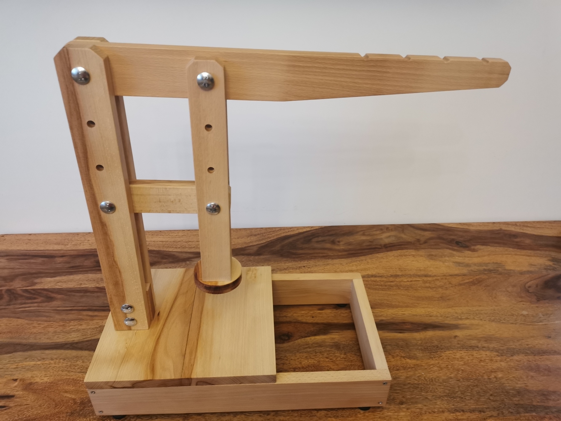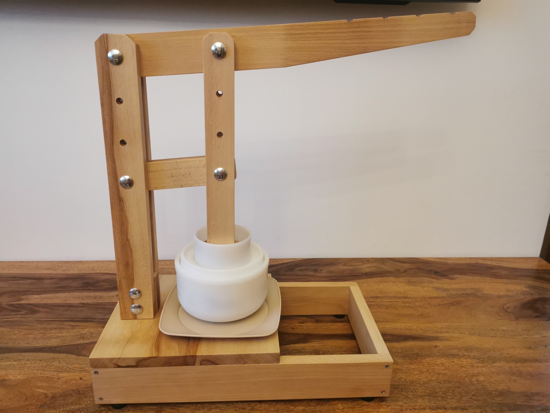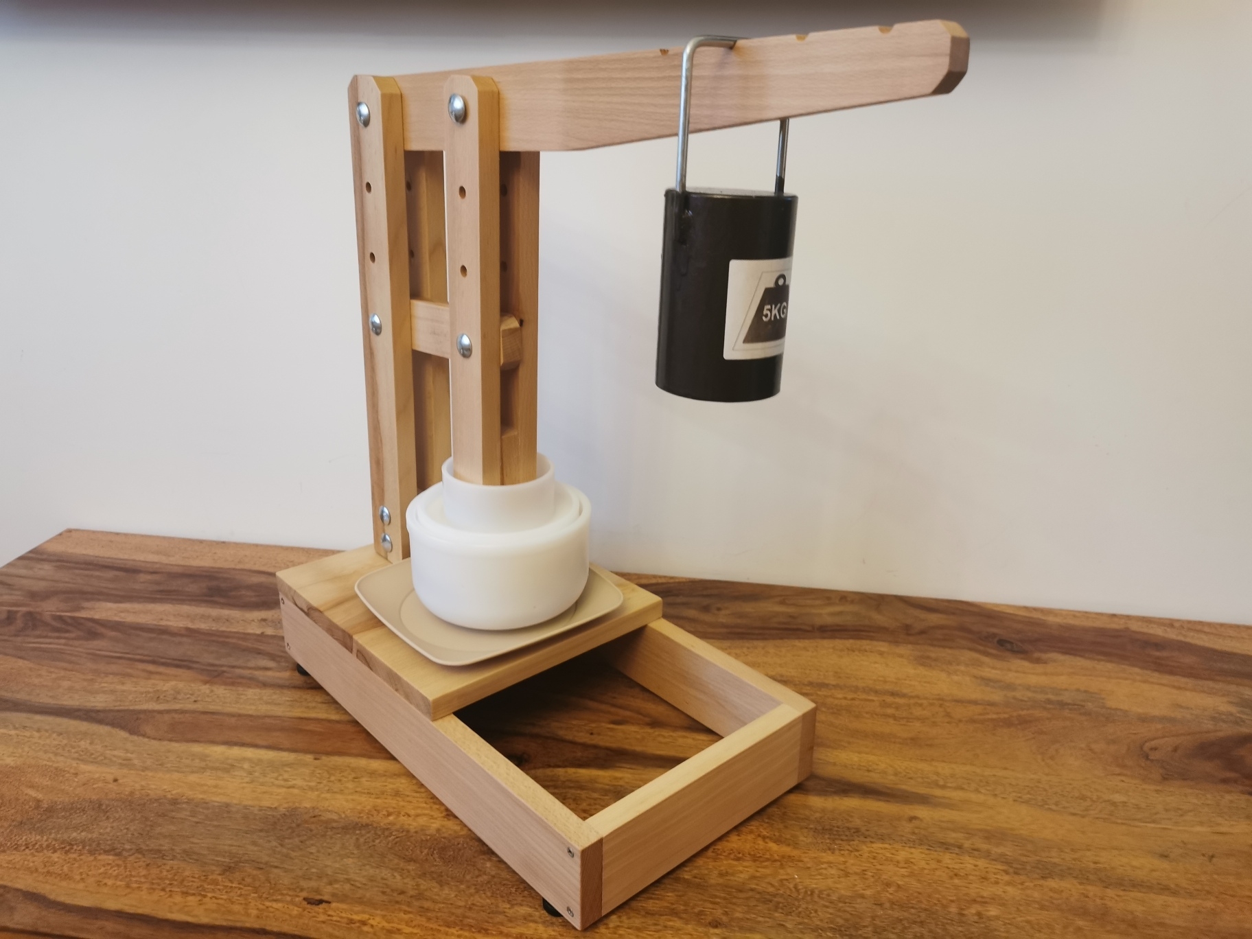 Lis je vyroben z kvalitního bukového dřeva, velice odolný. Na spodní části lisu jsou nastavitelné nožičky. S nastavitelnými rameny se snadno přizpůsobí podle potřeby sýrařské formě. Jeho součástí je miska pod formu.